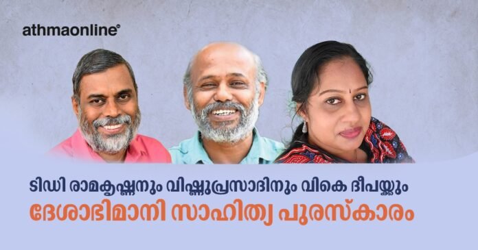 തിരുവനന്തപുരം: 2022ലെ ദേശാഭിമാനി സാഹിത്യപുരസ്കാരങ്ങള് പ്രഖ്യാപിച്ചു. നേവലിന് ടിഡി രാമകൃഷ്ണനും (പച്ച മഞ്ഞ ചുവപ്പ്) കവിതയ്ക്ക് വിഷ്ണുപ്രസാദിനും (നൃത്തശാല) കഥയ്ക്ക് വികെ ദീപയ്ക്കു(വുമണ് ഈറ്റേഴ്സ്)മാണ് പുരസ്രാപം. ഒരു ലക്ഷം രൂപയും ഫലകവും പ്രശസ്തിപത്രവുമാണ് പുരസ്കാരം. സമ്മാനദാന ചടങ്ങ് പിന്നീട് തീരുമാനിക്കുമെന്ന് ദേശാഭിമാനി ചീഫ് എഡിറ്റര് പുത്തലത്ത് ദിനേശനും ജനറല് മാനേജര് കെജെ തോമസും അറിയിച്ചു.